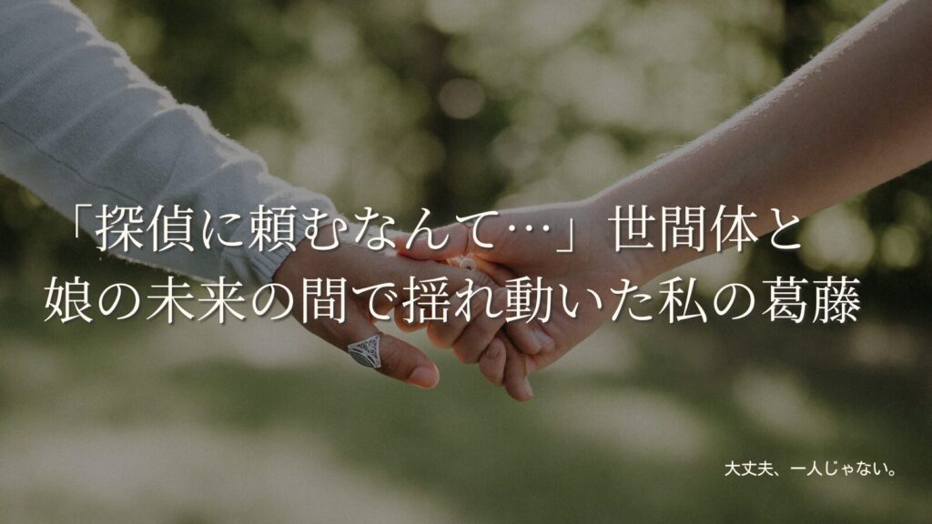 家出~発見までの記録 「探偵に頼むなんて…」世間体と娘の未来の間で揺れ動いた私の葛藤 「探偵を雇うなんて…」世間体と親のプライドが邪魔をして、決断できずにいませんか?自力捜索に限界を感じた母が、全てを捨てて娘の未来を選んだ心の葛藤を綴ります。最後の一歩が踏み出せないあなたの背中を押す記録。 2025.10.08 家出~発見までの記録